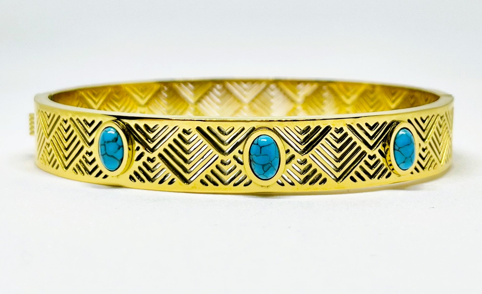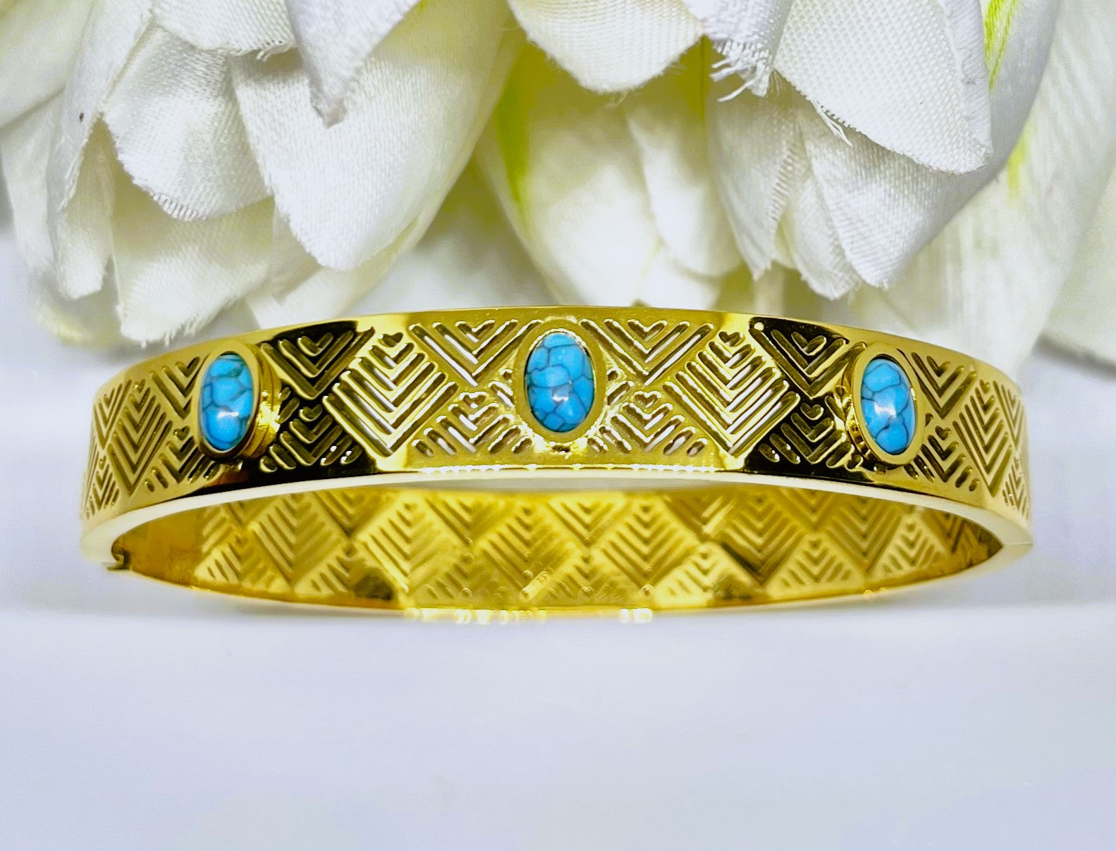 Exude royal allure with the Cleopatra Turquoise Stone Gold Bracelet, crafted in luxurious 18k gold. Adorned with a captivating turquoise stone, its anti-tarnish and waterproof design ensures lasting elegance and unmatched style