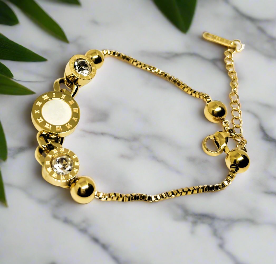 A vintage-inspired bracelet featuring Roman numerals and a moonstone charm. Crafted with an 18k gold-plated chain, it is anti-tarnish, waterproof, and perfect for timeless elegance with modern durability.